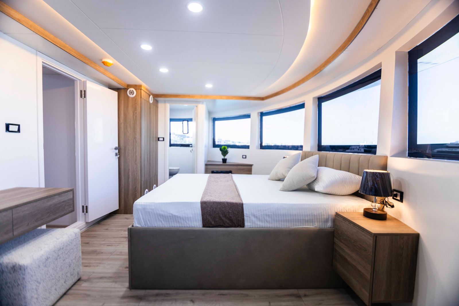 Lujoso barco con habitaciones anchas y suits en la parte superior con impresionantes vistas.
